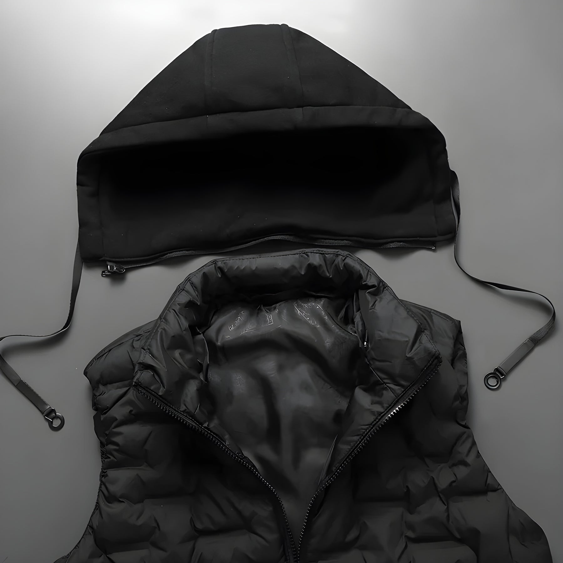 Built for lightweight core insulation, quilts form an embossed grid pattern on the synthetic outer shell, a relaxed, modern fit with a protective detachable hood that accents the warm, functional design.